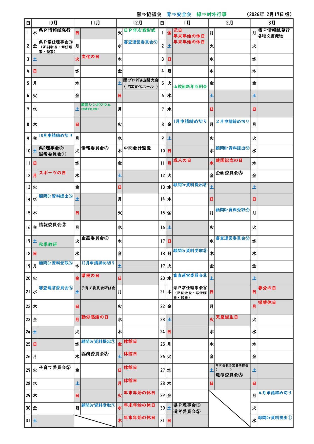 - 日本PTA全国協議会(日P),関東ブロックPTA協議会(関ブロ),県・郡市・単位PTA(単P),及び教育諸団体と連携し,教育条件整備を推進する。
