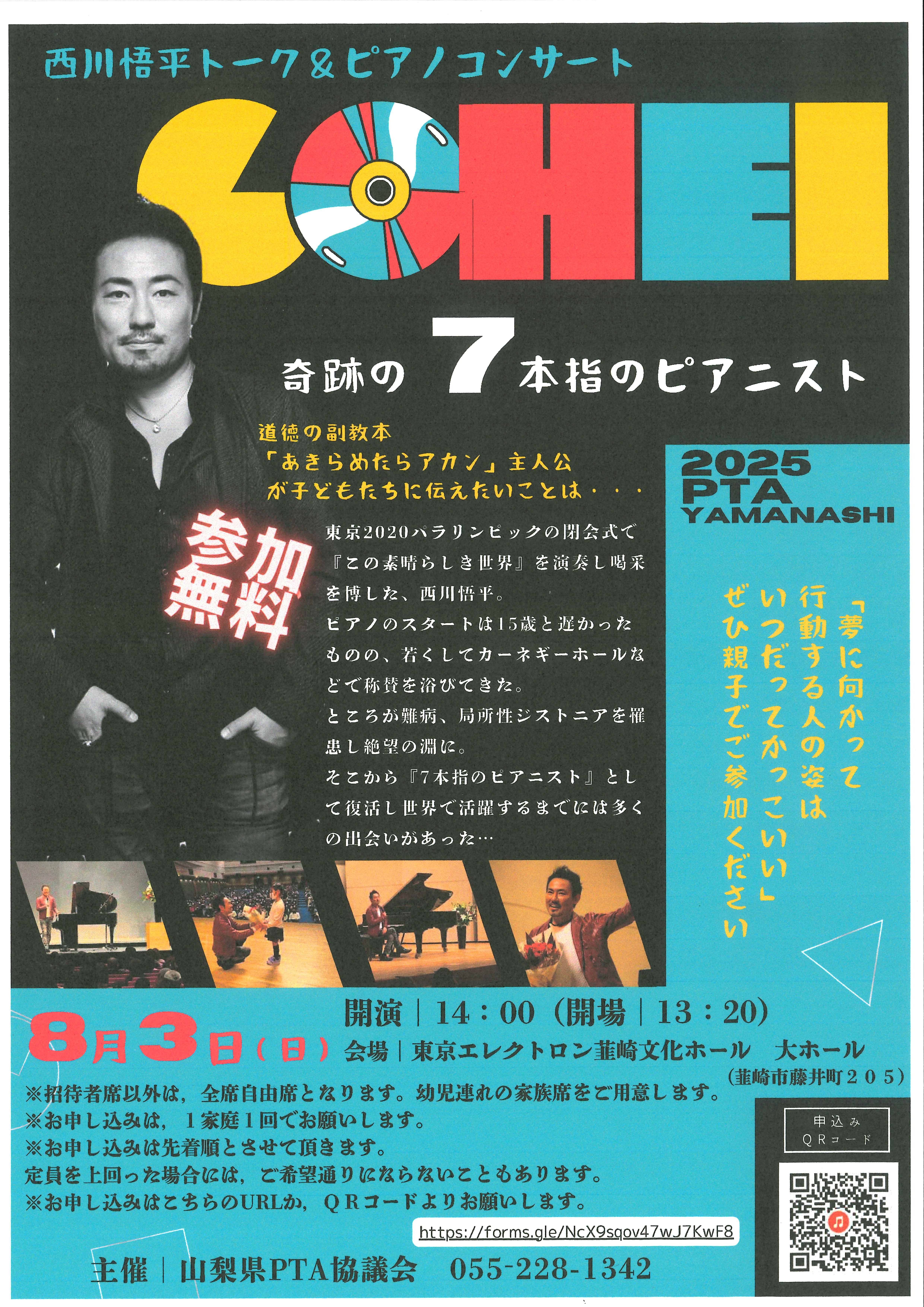 これは,西川様が山梨の子どもたちにメッセージを届けたいという思いと,多くの感想から「もう一度聞きたい」という強い願いが,実現可能にしたコンサートです。申し込みは、本日6月17日(火)18:00から、以下のフォームから先着順で受け付けます。