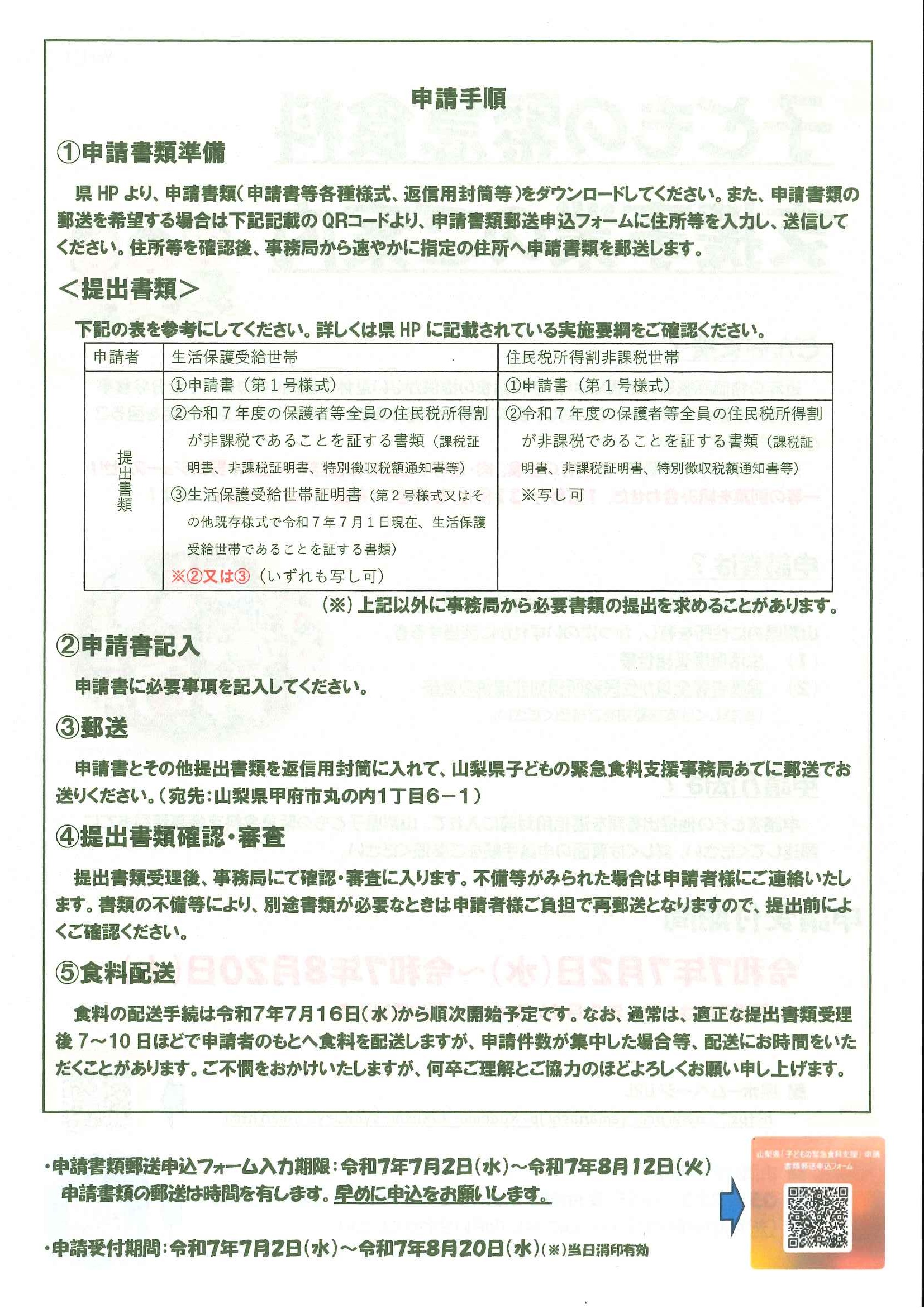 申請方法や申請受付期間等について、以下のチラシをご確認いただき、学校給食の提供のない夏休み期間中の子どもの生活安定にご活用ください。