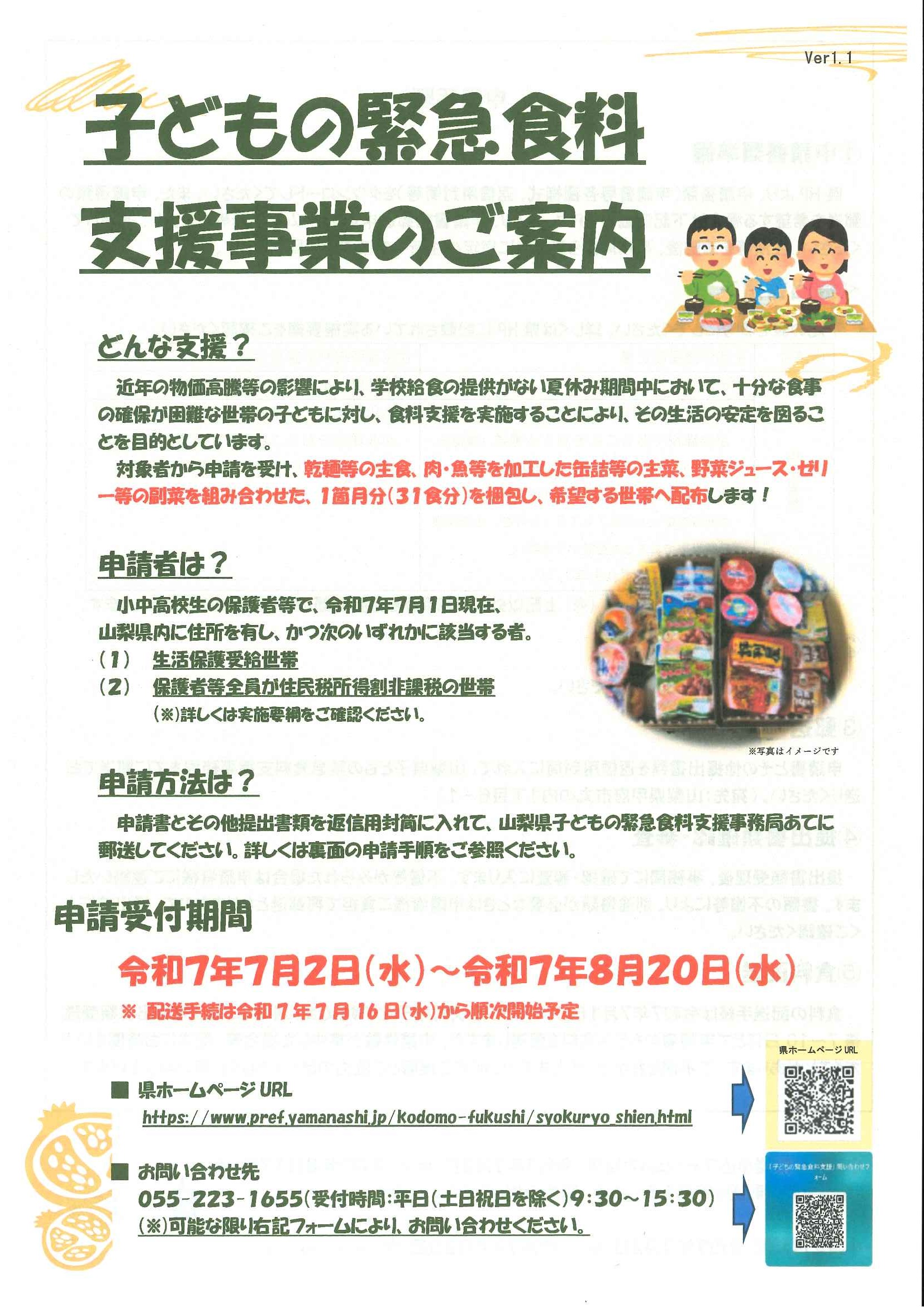 山梨県PTA協議会などが要望し、6月の山梨県議会で予算措置が決定した「子ども緊急食料支援事業」の案内が届きました。