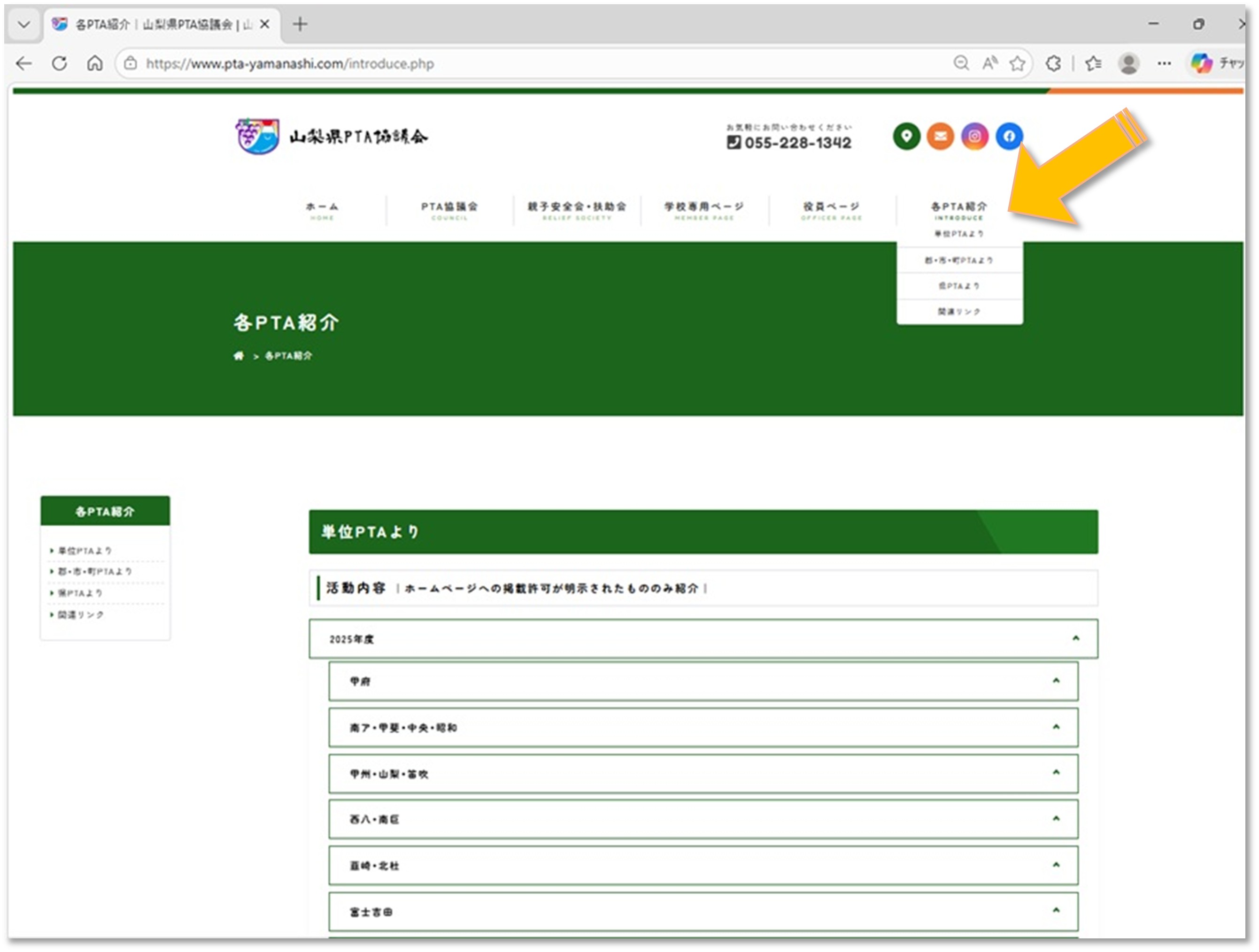 「各PTA紹介」をクリックし、「単位PTAより」の「活動内容」からご覧いただけます。